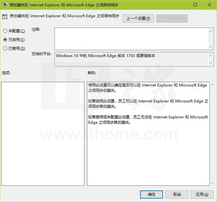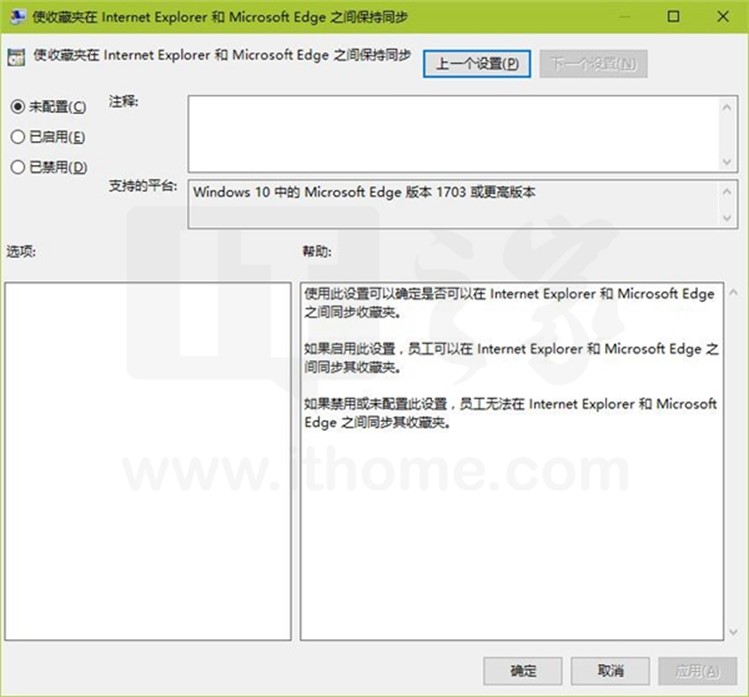 如果你是按照上文中提供的利用Windows专业版/企业版/教育版中的组策略编辑器来设置的方法设置的,那么只需要再次找到组策略编辑器中的计算机配置-管理模板-Windows组件-Microsoft Edge-使收藏夹在Internet Explorer之间保持同步,把已启用改为未配置;