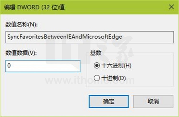 双击DWORD(32位)值SyncFavoritesBetweenIEAndMicrosoftEdge,将数值数据下的输入框中的数字设置为0。