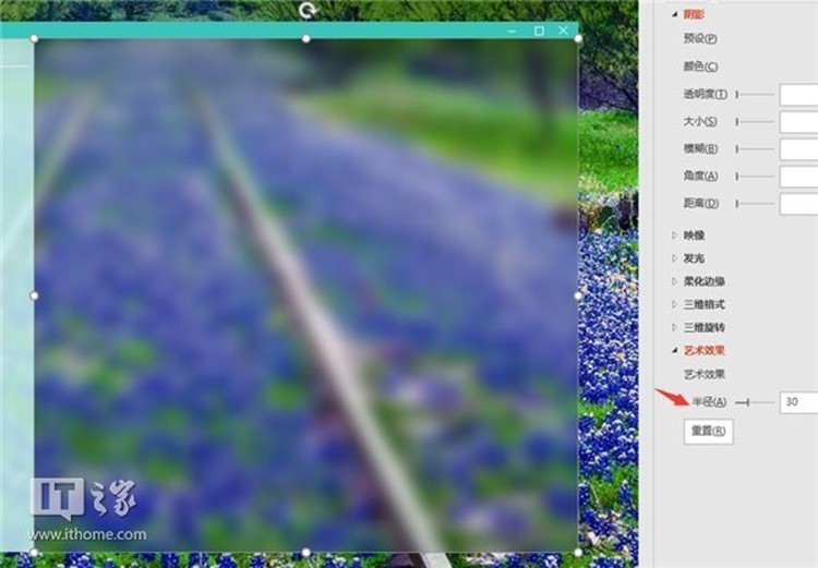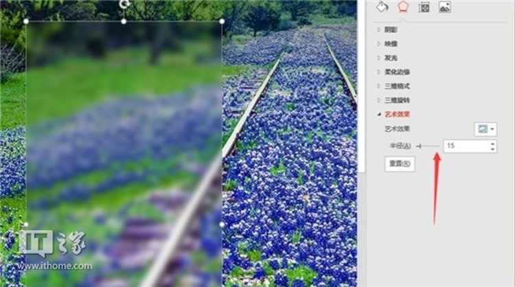 4.选中剪裁后的图片,在图片工具(格式)选项卡里,找到艺术效果,选择虚化效果,虚化半径15%。