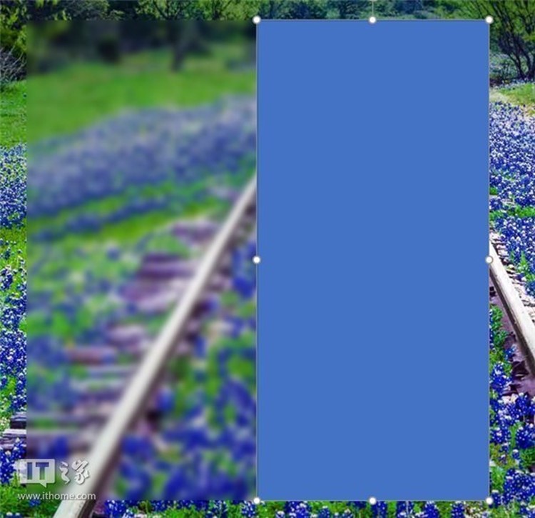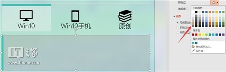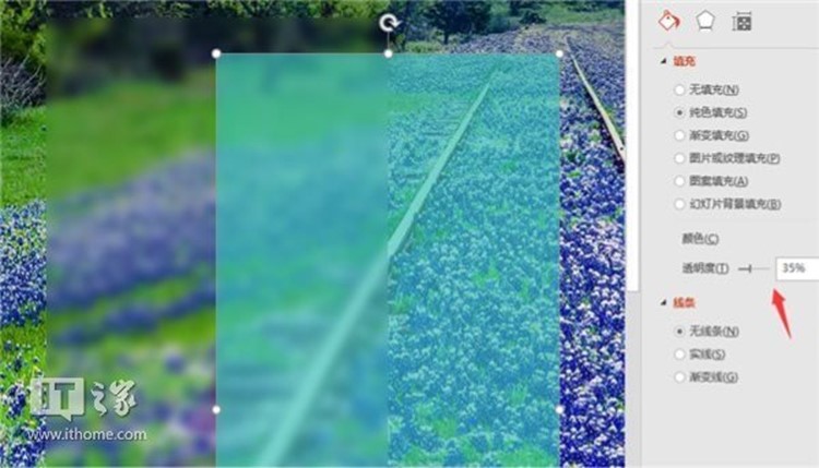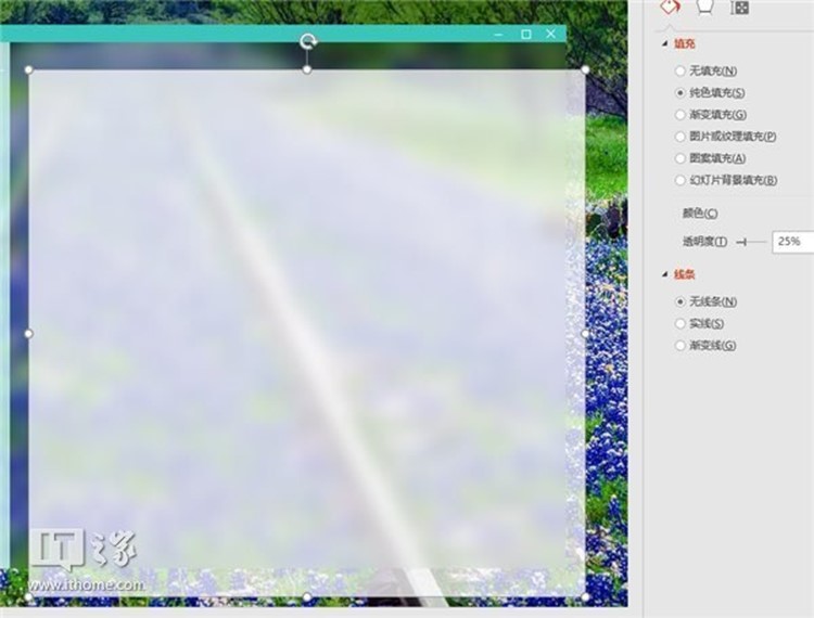 6.把矩形设置成无形状轮廓,颜色设置成系统主题色(方法:截一张开始菜单的磁贴的截图,插入幻灯片中,然后取色器大法好),并将透明度调到35%。把这个矩形覆盖在剪裁-虚化部分上,就实现了亚克力透明效果。