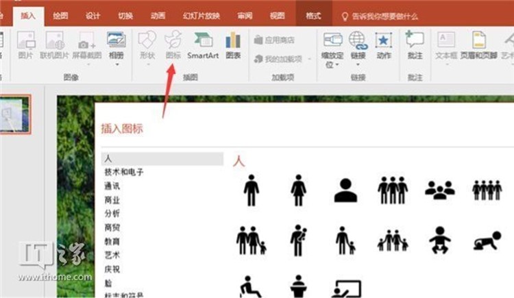 14.在插入选项卡找到"图标",点击。多选想要的图标,选好后点击插入。下载下来的图标默认都是黑色的,可以根据需要在图形工具(格式)中填充为白色。
