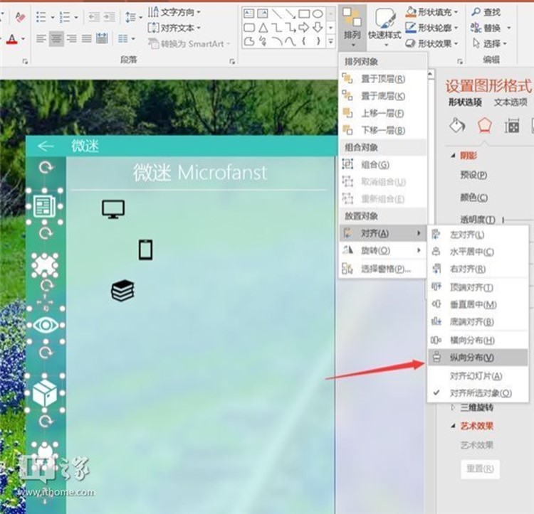 先说竖的。把图标排列到大致正确的位置(利用智能参考线,这很容易),然后按住CTRL多选。多选完毕后,在图形工具(格式)中找到对齐,点击纵向分布即可。