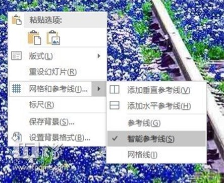 5.插入一个矩形,调整它的大小到跟剪裁-虚化部分一样大(请开启智能参考线功能方便操作:幻灯片上右键,选择网格和参考线,启用智能参考线)。