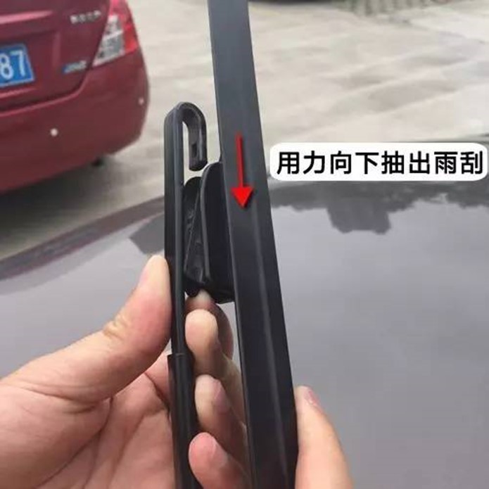 打开盖子后,拿紧雨刮用力向下一推就能把雨刮抽出来了。