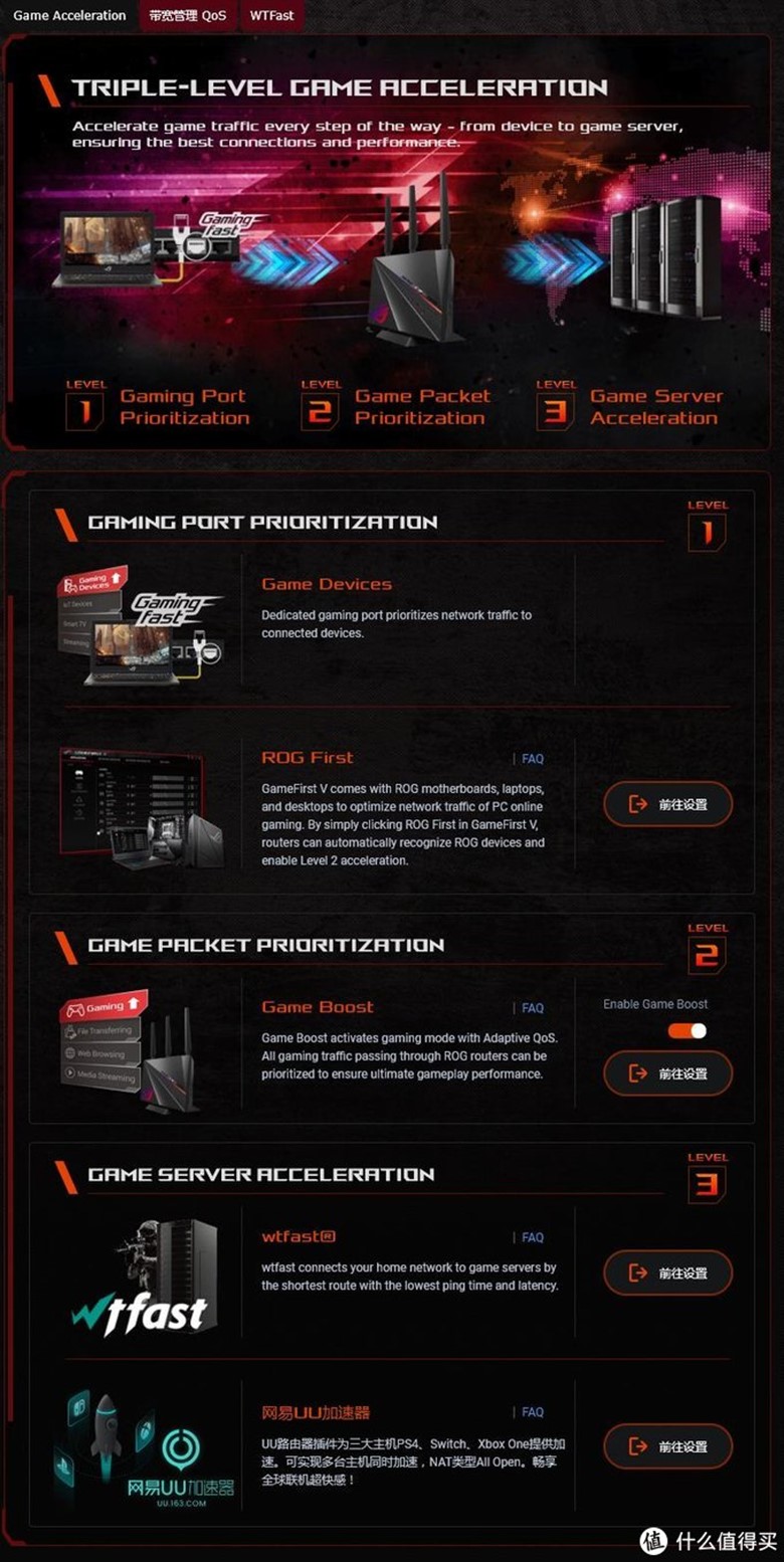 ▼其内置电竞加速才是它最值得购买的亮点,提供3级加速,第一级是针对华硕的ROG主板提供加速,第二级是开启Game Boost功能,利用QOS优先处理、传输、交换关于游戏的数据,第三级是WT-Fast加速器和网易UU加速器。