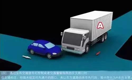 (四)通过没有交通信号灯控制或者交通警察指挥的交叉路口时,在交通标志、标线未规定优先通行的路口、未让右方道路的来车先行的,图中所示为A车负全责。