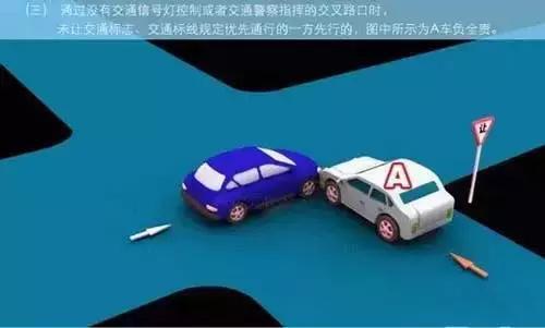 (三)通过没有交通信号灯控制或者交通警察指挥的交叉路口时,未让交通标志、交通标志线规定优先通行的一方先行的,图中所示为A车负全责。
