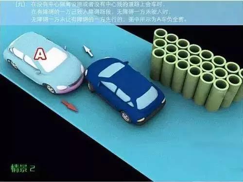 (九)情景二:在没有中心隔离设施或者没有中心线的道路上会车时,在有障碍的一方已驶入障碍路段,无障碍一方未驶入时,无障碍一方未让有障碍一方先行的,图中所示为A车负全责。