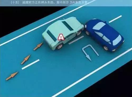 (十五)超越前方正在掉头车的,图中所示为A车负全责。