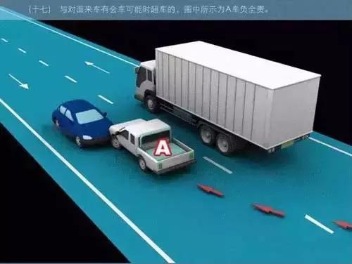 (十七)与对面来车有会车可能时超车的,图中所示为A车负全责。
