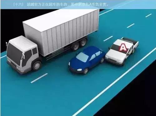 (十六)超越前方正在超车的车的,图中所示为A车负全责。