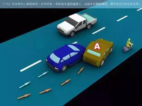 (十九)在没有中心线或者同一方向只有一条机动车道的道路上,从前车右左侧超越的,图中所示为A车负全责。