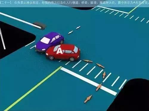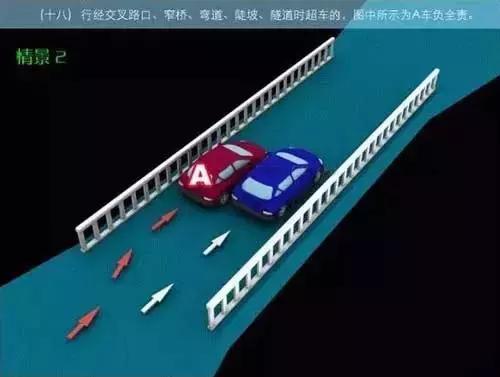 (十八)情景二:行经交叉路口、窄桥、弯道、陡坡、隧道时超车的,图中所示为A车负全责。