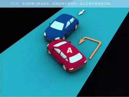 (二十)在没有禁止掉头标志、标线的地方掉头时,未让正常行驶车先行的,图中所示为A车负全责。