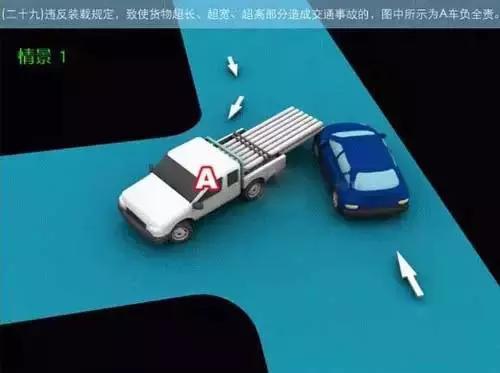 (二十九)情景一:违反装载规定,致使货物超长、超宽、超高部分造成交通事故的,图中所示为A车负全责。
