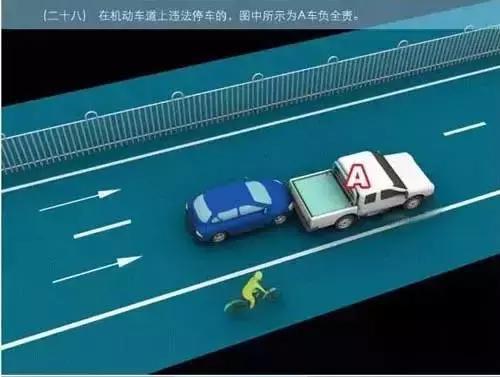 (二十八)在机动车道上违法停车的,图中所示为A车负全责。