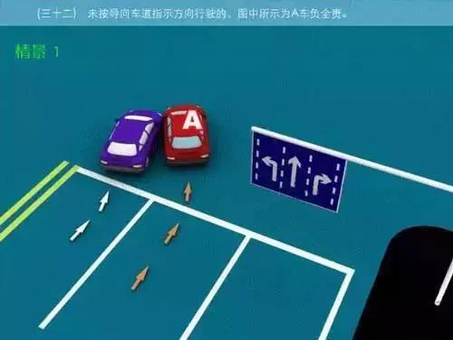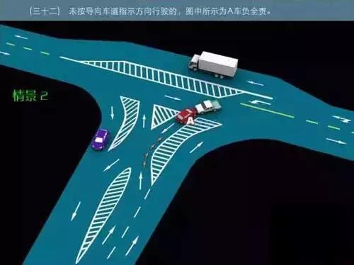 (三十二)情景二:未按导向车道指示方向行驶的,图中所示为A车负全责。
