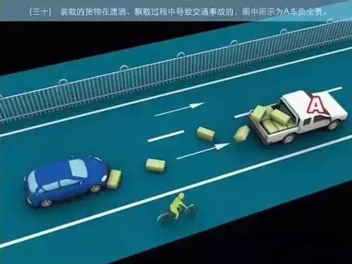 (三十)装载的货物在遗洒、飘散的过程中导致交通事故的,图中所示为A车负全责。