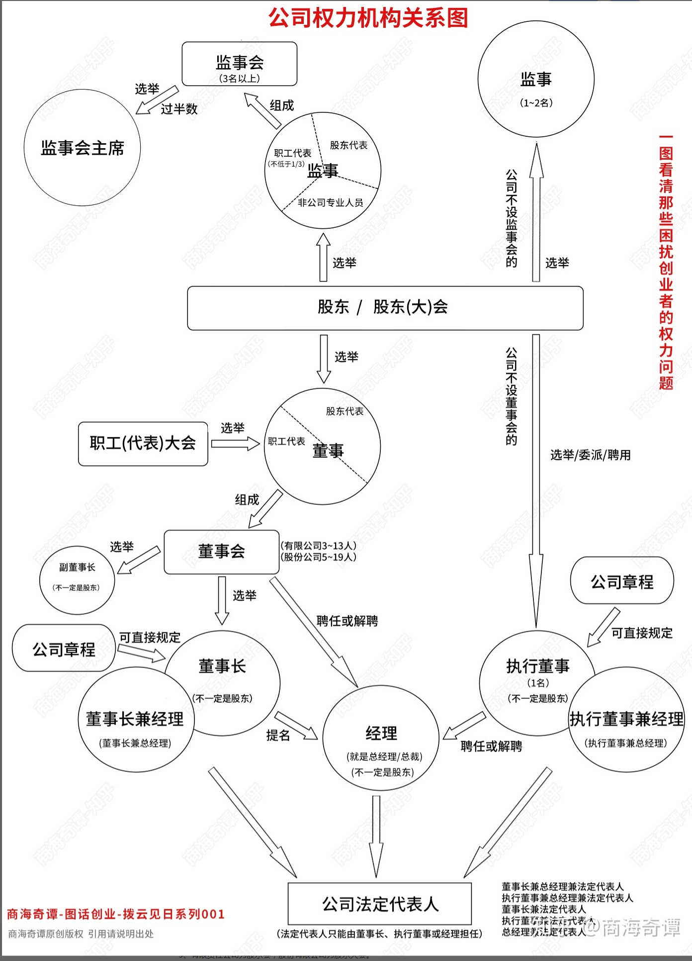 有鉴于此,商海奇谭用一个关系图,清晰明了地展示出股东、董事、监事和法定代表人之间关系,如下图: