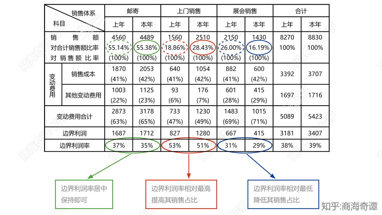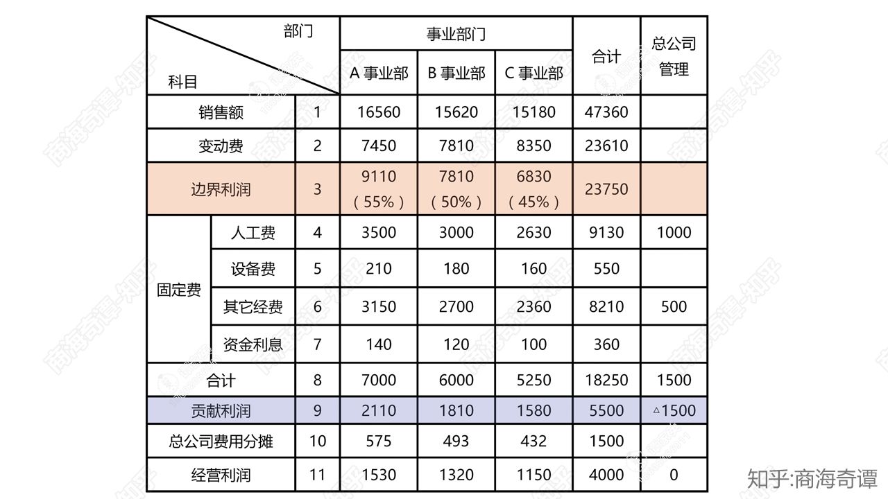 边界利润(率):评价经营能力即现金流创造能力。例中事业部A(55%)>B(50%)>C(45%) 贡献利润:评价部门对公司的现金利润贡献。事业部A (2110) > B (1810) > C (1580)