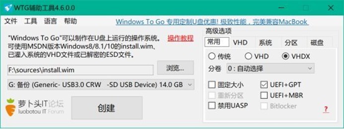 所谓传统,其实是不创建虚拟磁盘,直接将WTG安装在你的U盘上。在你点击"创建"时,软件会提示"可能无法引导",事实上: