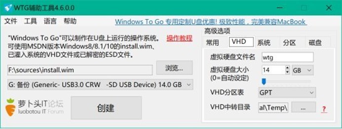 e.点击右侧选项卡中的"VHD",这里可以自定义虚拟硬盘。比较关键的是"虚拟硬盘大小",这是因为在WTG运行时虚拟硬盘文件会自动扩充为你设定的大小,如果U盘可用空间不足,WTG就无法启动,你可以根据自己需要设定大小,但不推荐小于14GB。分区表一定要是GPT。VHD中转目录最好不要是你用的U盘。