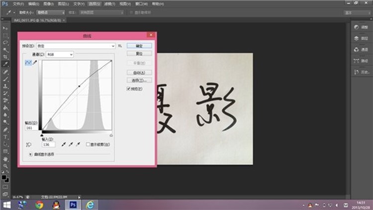 打开照片以后按Ctrl+M调出曲线,把曲线上拉或下拉来调亮或调暗照片,使文字和背景达到最大的对比度:
