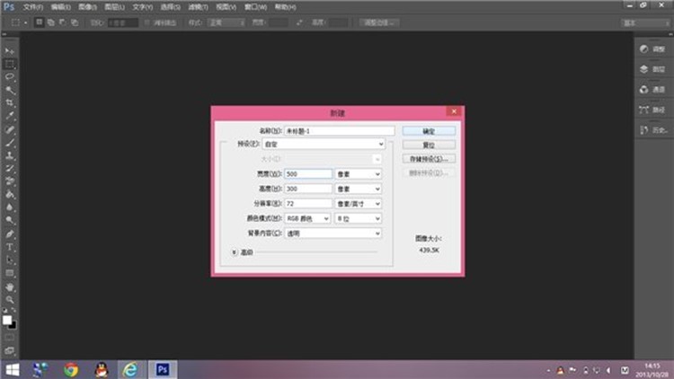 打开Photoshop,按Ctrl+N新建画布,横竖选择500*300像素即可,没有硬性规定,几百像素的水印用起来更方便,背景内容选"透明"。