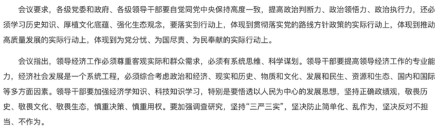 比如,会议提到,领导经济工作必须“尊重客观实际和群众需求,必须有系统思维、科学谋划”“要加强经济学知识、科技知识学习”“坚持正确政绩观,敬畏历史、敬畏文化、敬畏生态,慎重决策、慎重用权”“坚决防止简单化、乱作为,坚决反对不担当、不作为”。