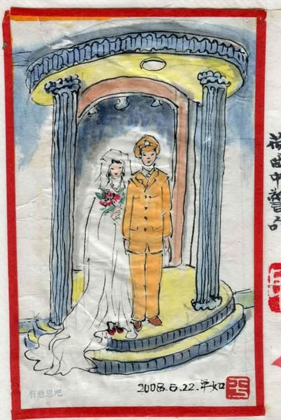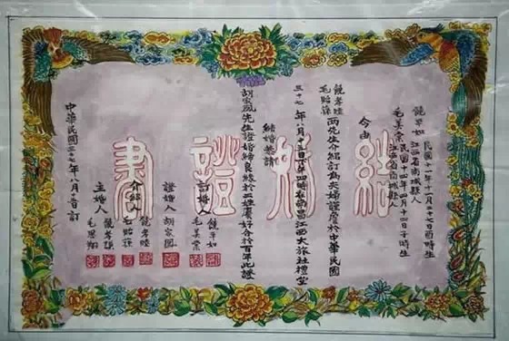 我们的结婚证书。饶平如和美棠两人的结婚证书在“文革”中烧了,饶平如靠记忆重新画了一张。饶平如特意标注说明,图案左上角的鸟叫“鸾”,右上角的鸟叫“凤”,“鸾凤和鸣”喻意“夫妇和谐”。