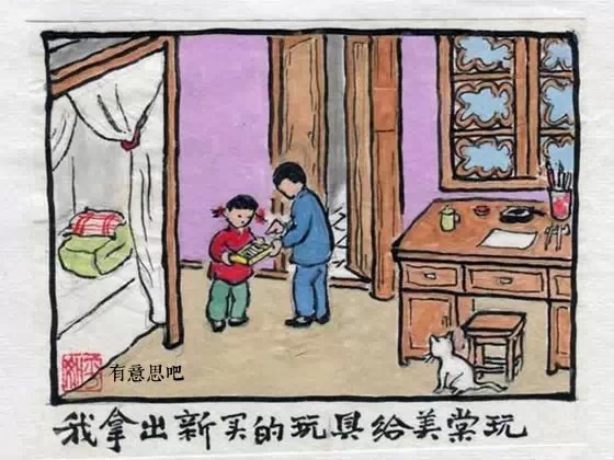 我拿出新买的玩具给美棠玩。《我俩的故事》,一笔一笔,从美棠童年画起。我11岁时,在暮春季节的某天下午,美棠一家人来我家做客。美棠(8岁)从我父母住的前房走到后房,为了招待新来的小客人,我把新买的一件玩具给她玩,她玩得似乎很觉有趣。