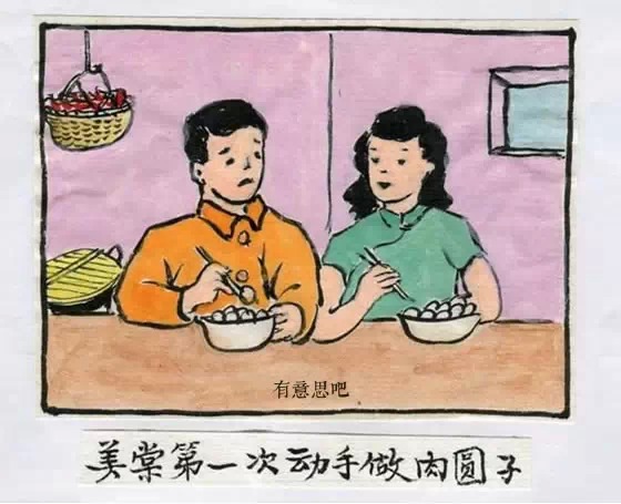 美棠第一次动手做肉圆子。美棠和我到了徐州东贺村,住入一家农舍。美棠亲手做菜——烧肉圆汤。端上来后,我尝试了一个,觉得味道不对劲,便问:“怎么肉圆里有些碎屑似的东西,不大好吃?”“那是肉皮呀!”她从容不迫地回答。