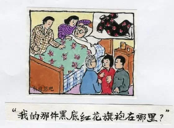 我的那件黑底红花旗袍在哪里?美棠在病程晚期,常说些不合实际的话,有一次她忽然向我要她的一件黑底红花旗袍,实际上这件旗袍根本不存在(也许在多年以前她有过,此时从陈旧的记忆中又浮现出来了)。我当时确想重新做一件以满足她的要求,曾与子女们商议此事,但不久她即忘却了。