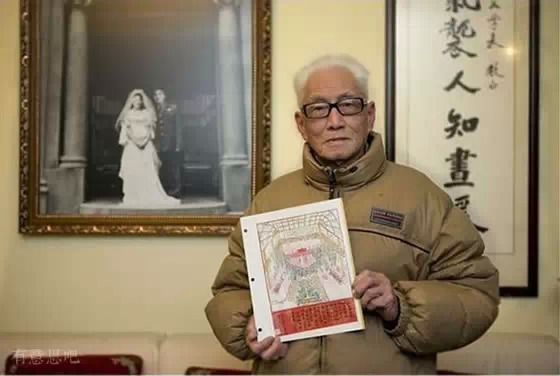 上海市航新路,饶平如老人手拿自己画的婚礼图,他身后的墙上挂着他与老伴的婚纱照,由于原先的照片已丢失,这张婚纱照是后来制作的。