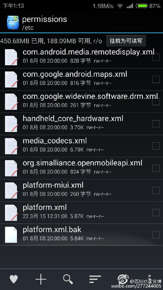 RE管理器, 用文本编辑器打开/system/etc/permissions目录下的"platform.xml"文件(挂载读写),在