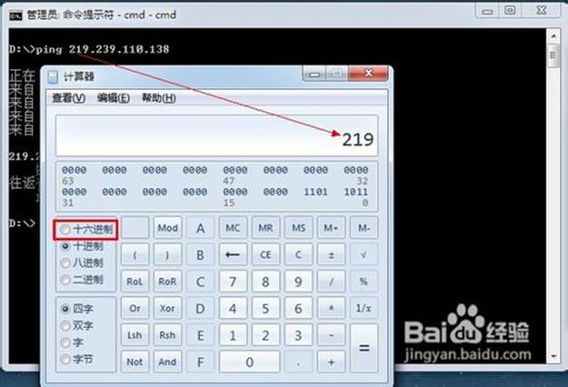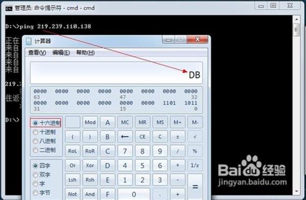转换为十六进制数,如图,已经将10进制的219转换为了十六进制的DB了。