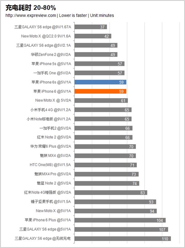 以下是iPhone 6s评测中的充电速度数据。可以见到使用了快速充电技术三星Galaxy S6 edge、New Moto X、华硕Zenfone 2拥有非常快的充电速度。