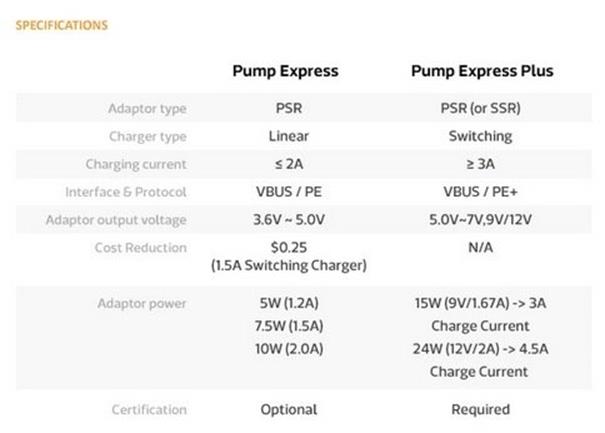 MTK的MTP Pump Express快充技术分为两种,一种带Plus一种不带Plus,带Plus的可以支持到9V/12V,从规格来看,普通的Pump Express支持前者,充电电流不超过2A,而支持Pump Express Plus的产品则可以达到12V/3A,这一类产品目前市面上比较少,魅族的移动电源和魅族支持mCharge的手机属于这一类产品。