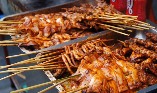 一起去登州路吃烧烤,穿着裤衩背心,吃完了我们就去逛台东夜市。