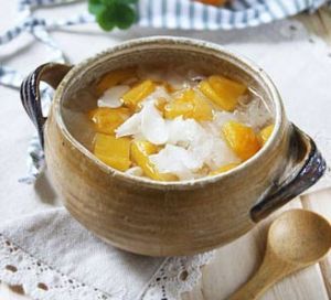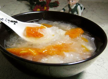 银耳100克,罐头糖水橘200克,白糖适量。先将银耳去蒂洗净,加入白糖和适量清水,待银耳质地预想软时加入罐头橘瓣,稍煮,当点心食用。具有补气益肾、止咳化痰的功效。适用于肺热咳嗽,肺燥干咳,痰中带血等。