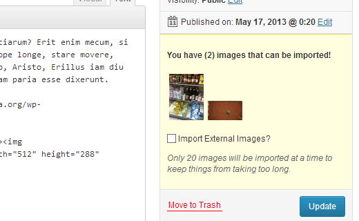 首先安装并激活插件,然后在多媒体>>导入图片下,插件会搜寻并显示所有文章里的外部图片。用户需要做的就是点击"Import Images Now"按钮,就能导入所有图片。