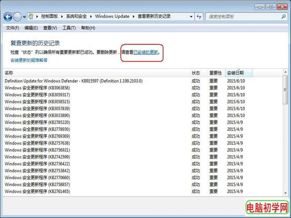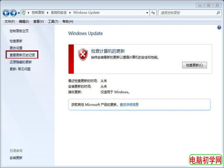 - 计算机右键属性-打开Windows Update,然后点击查看更新历史记录。