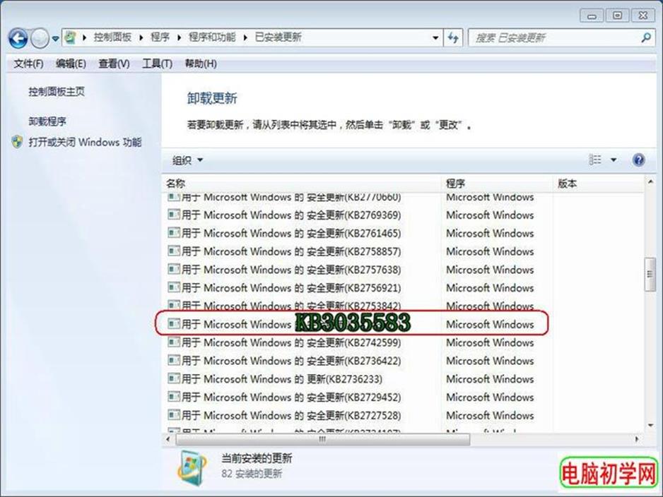 3.在列表中找到KB3035583,双击删除,重启电脑即可。注意以后不要在安装此补丁。