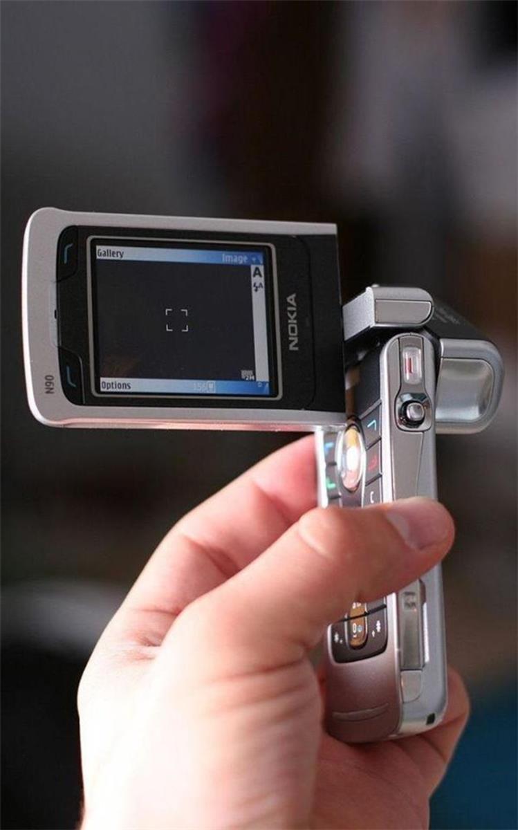这款Nokia N90手机发布于2005年,它是手机和视频摄像机的合体,显得有些超前。它的可旋转的屏幕可以将这款手机变成一个便携式摄像录像机。它配置2MP卡尔·蔡司(Carl Zeiss)摄像机和LED闪光灯。