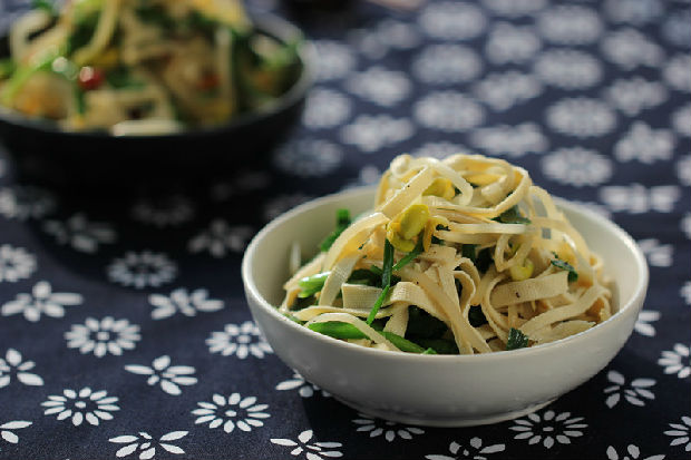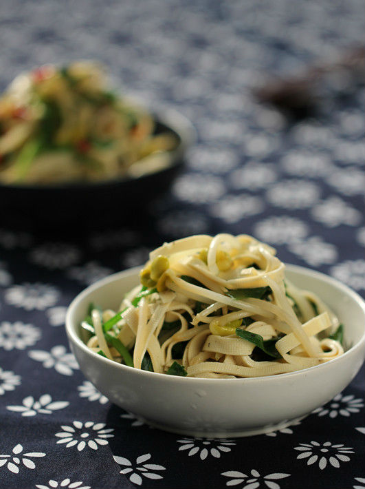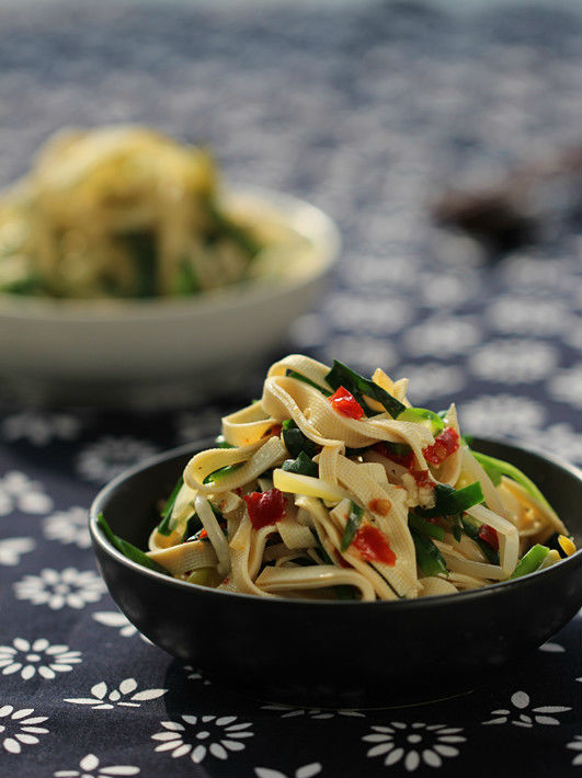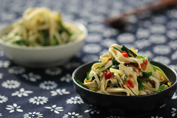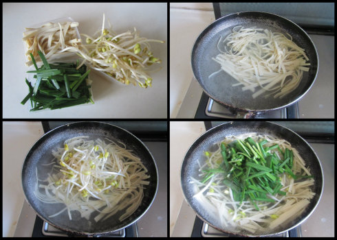 1. 焯水时须先在开水中加入适量的盐和几滴油,注意青菜下入顺序,根据成熟时间长短决定下入顺序,因此我们先放入豆腐丝、再豆芽,最后是韭菜, 韭菜一烫就需要将捞出;
